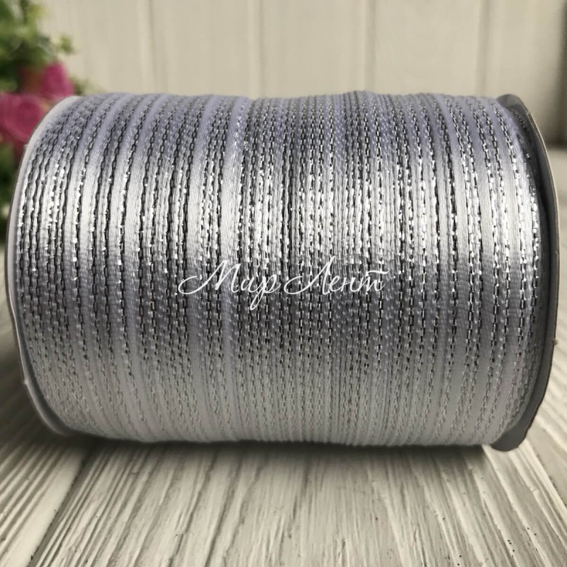 Атлас 0,3 см люрекс срібло, білий, рулон 225 м