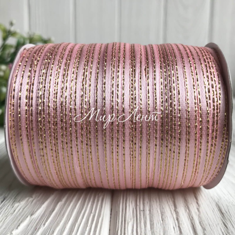 Атлас 0,3 см люрекс золото, світло-рожевий, рулон 225 м