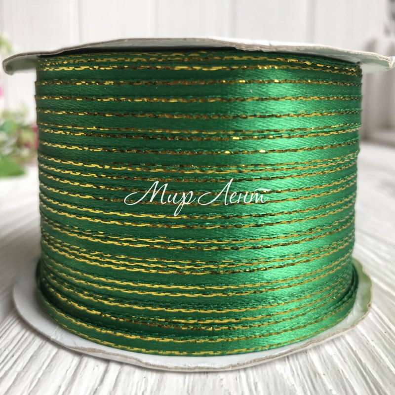 Атлас 0,3 см люрекс золото, зелений, рулон 225 м