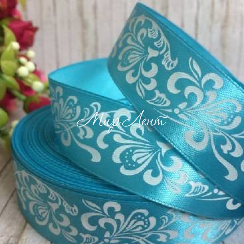 Атлас 2,5 см, орнамент, светло-бирюзовый