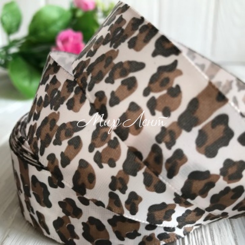 Атлас 0,9 см, молочно-сірий леопард, рулон 18 м
