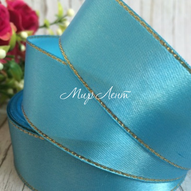 Атлас із люрексом 2,5 см (золото), світло-бірюзовий, рулон 33 м
