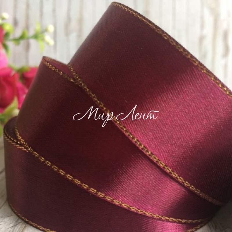 Атлас із люрексом 2,5 см (золото), вишневий, рулон 33 м