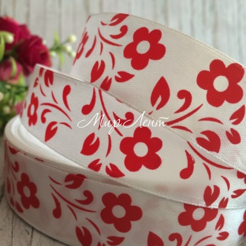 - Модель: Атлас цветок-листик, 2,5 см, бело-красный