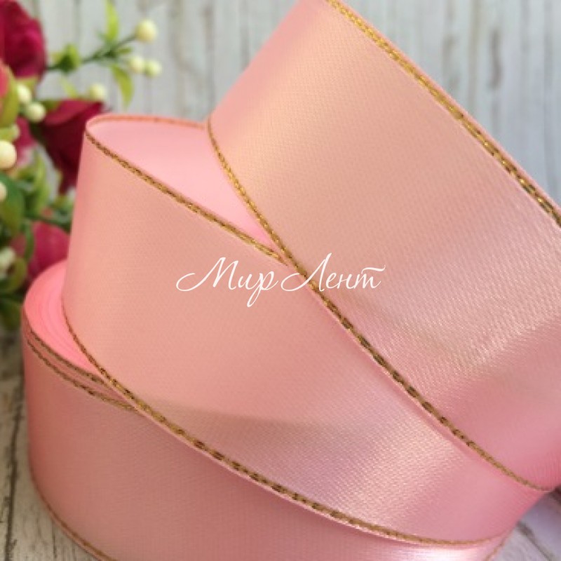 Атлас із люрексом 2,5 см (золото), світло-рожевий, рулон 33 м