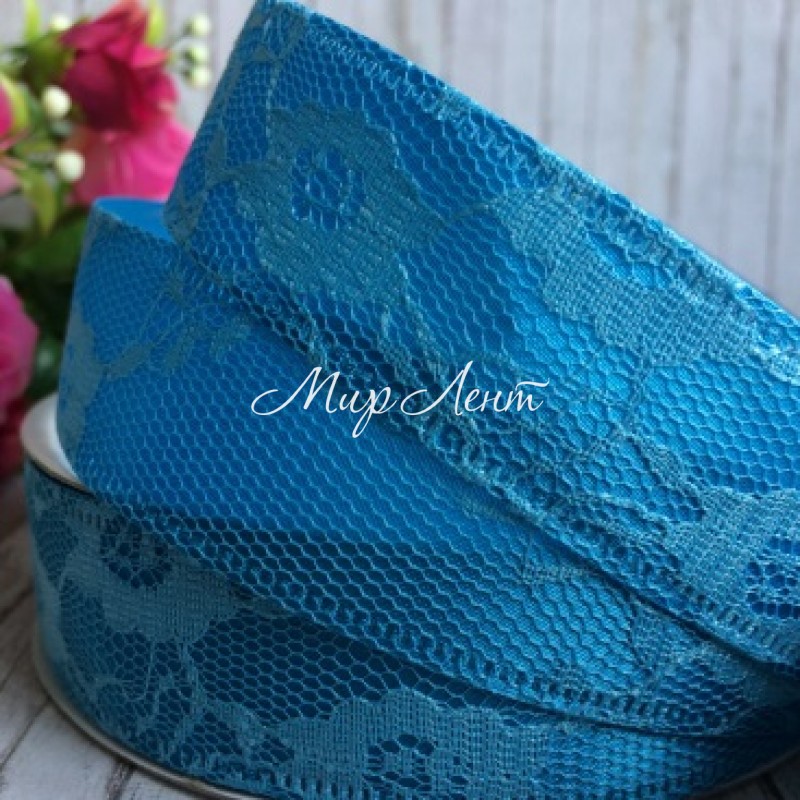 Атлас з мереживом New, 2,5 см, бірюзовий