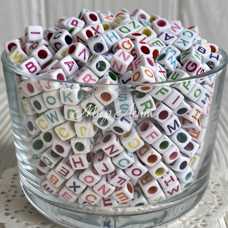 Бусина буква, 6 мм, квадрат (біло-кольоровий мікс), маленький пакет 100 г