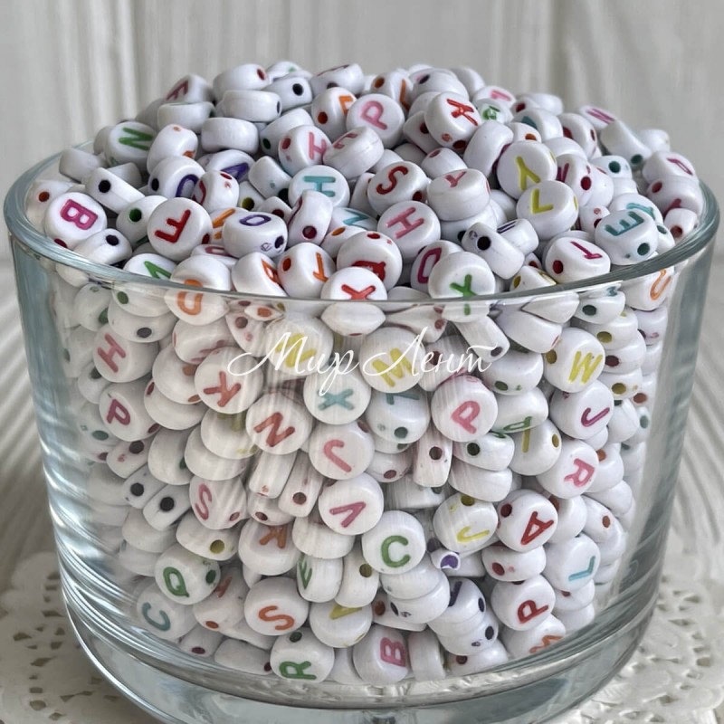 Бусина буква, 8х4 мм, круг (біло-кольоровий мікс), маленький пакет 100 г
