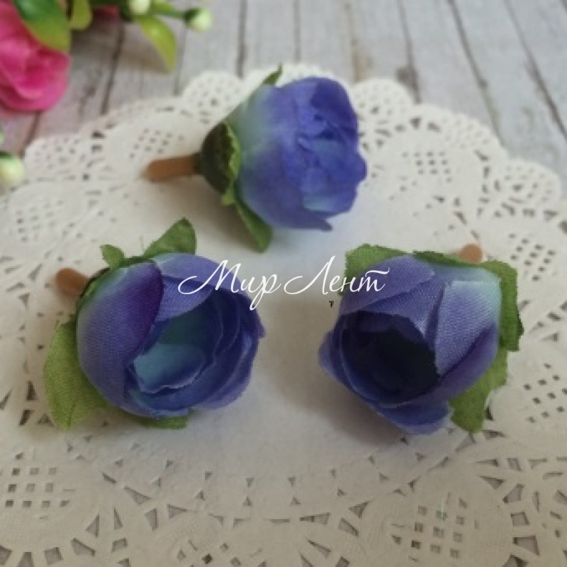 Бутон троянди тканинний (з листочками), 2,5 см, синій
