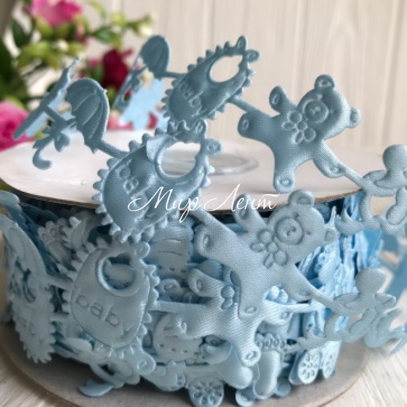 Мереживна дитяча стрічка, 2 см, пляшечка-парасолька-коляска, блакитна