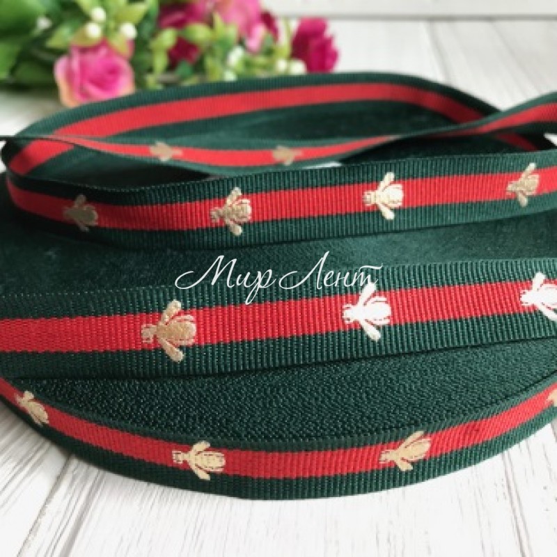 Стрічка Gucci з мухою, 1,5 см, темно-зелено-червона смуга