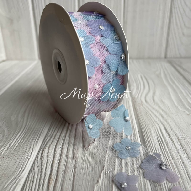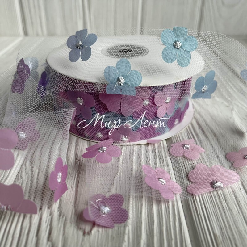 Стрічка з фатину з шифоновими квітами, 4 см, бірюзово-малиновий, метр