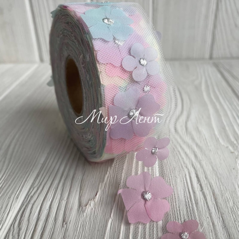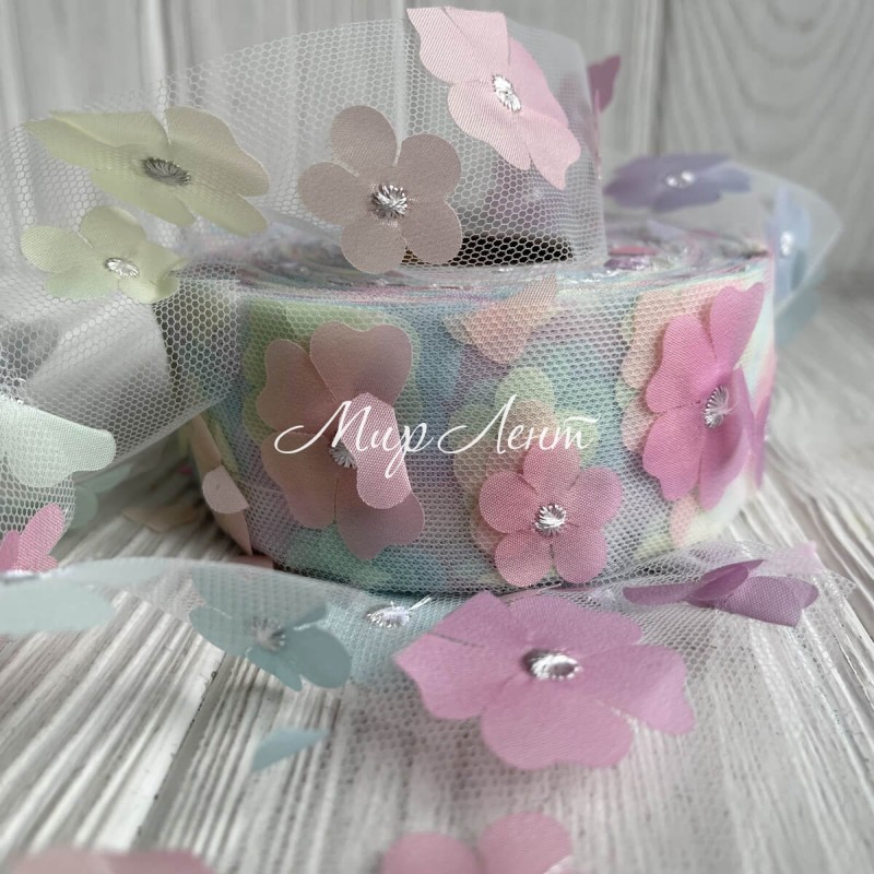 Стрічка з фатину із шифоновими квітами, 4 см, жовто-рожевий, метр