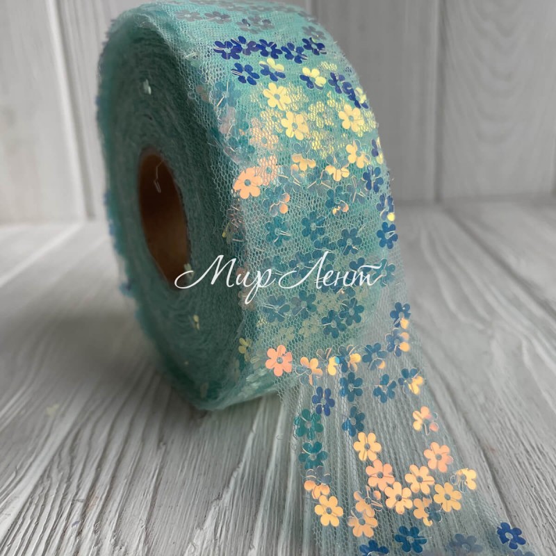 Стрічка з фатину з паєтками, 4 см, м'ятний, метр