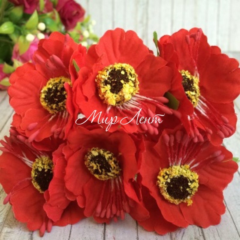 Мак, 4 см, червоний, 6 квіточок у пучку, 1 пучок