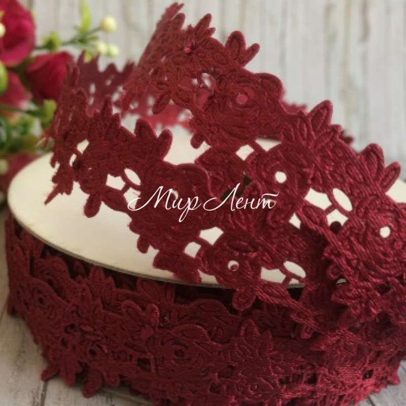 Мереживна стрічка трояндочка, 2,5 см, бургунді