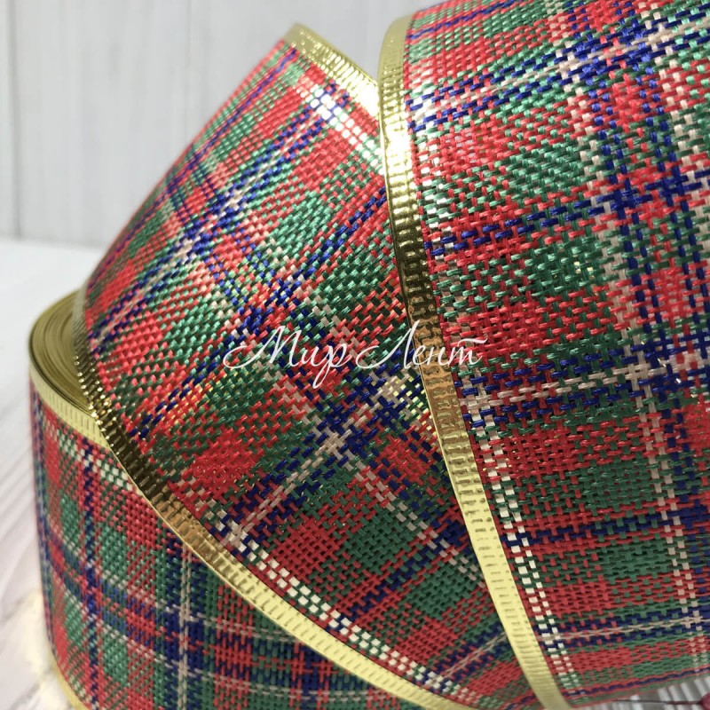 Новорічна стрічка мішковина шотландка, 6,3 см, червоно-зелено-синя, метр
