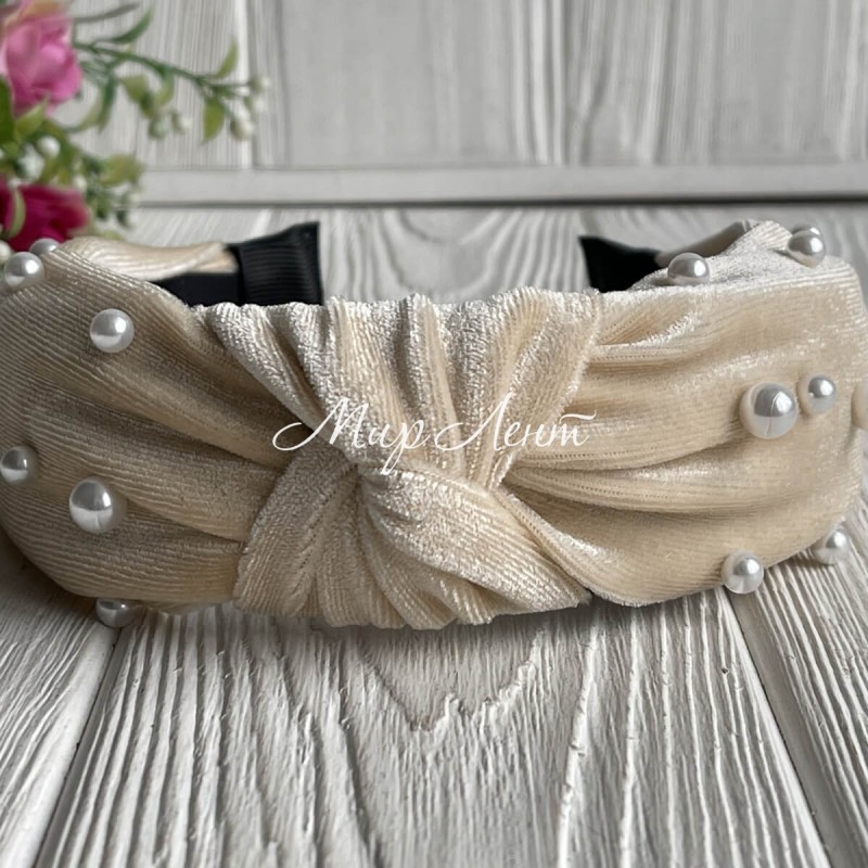 Обруч чалма велюр із перлами, 4,5 см, молочний, шт.