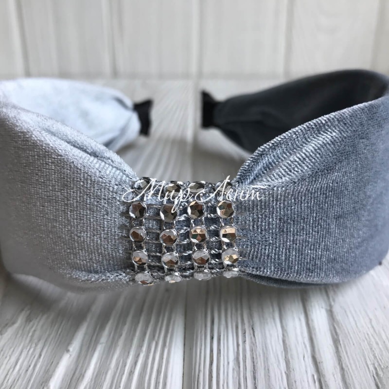 Обруч велюр із вставкою з каміння, 5 см, світло-сірий, шт.