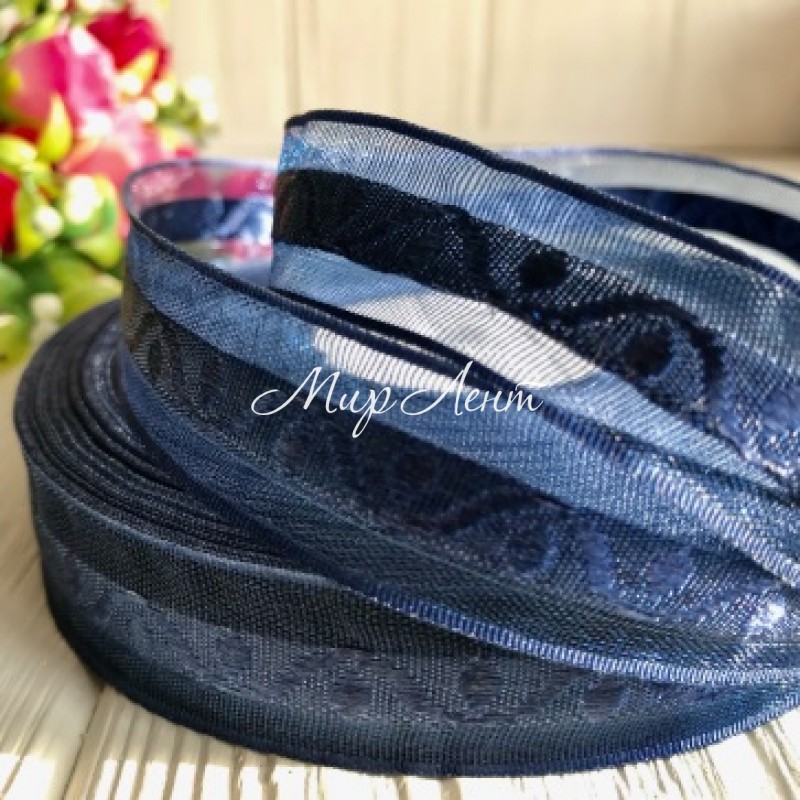 Органза з атласним візерунком, 2 см, сапфіровий