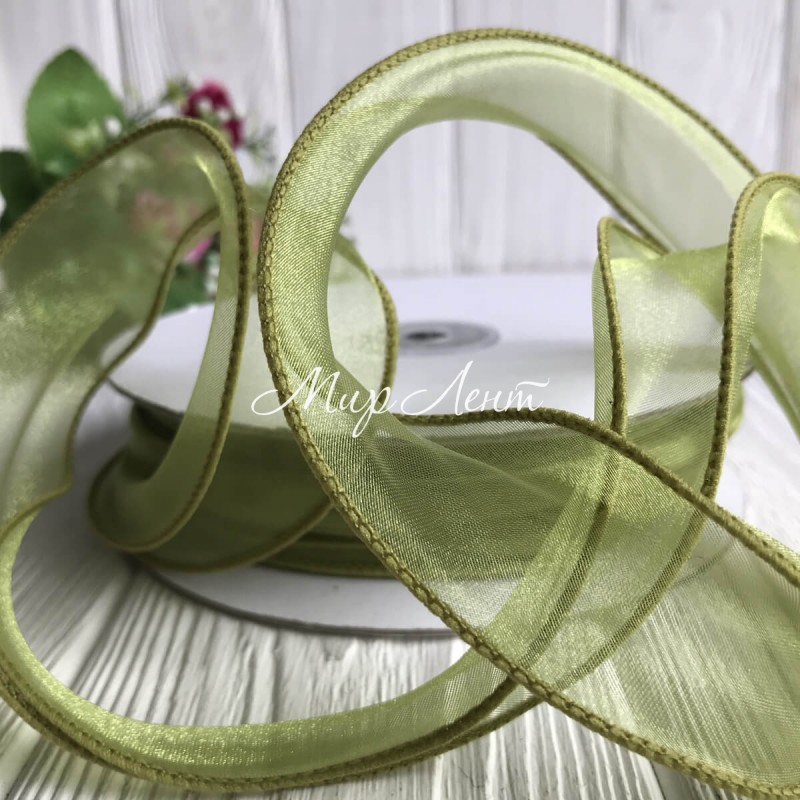 Органза з прошитим кантом, 3 см, оливкова, рулон 23 м