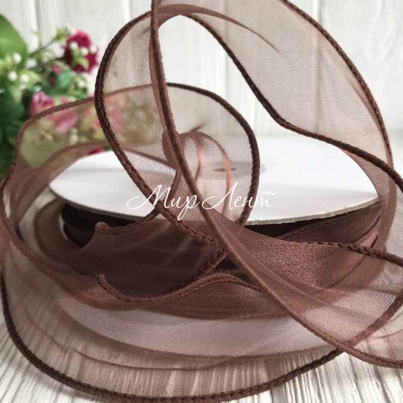 Органза з прошитим кантом, 3 см, шоколадний, рулон 23 м