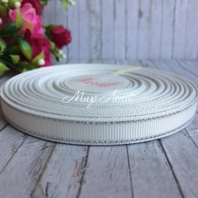 Репс 0,9 см люрекс (срібло), білий, рулон 23 м