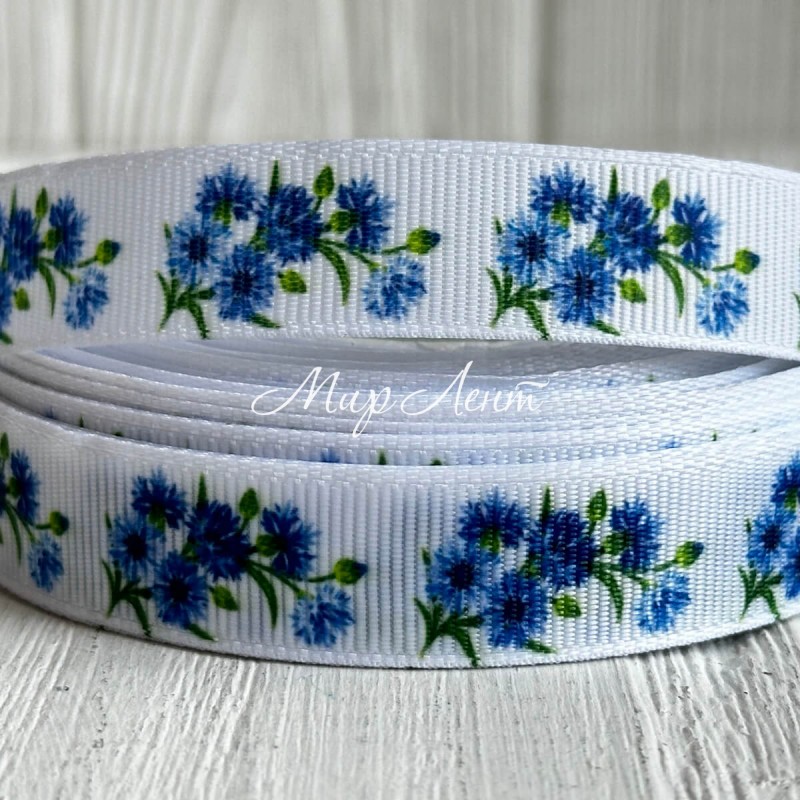 Репс 1,5 см, сині волошки, на білому фоні, метр