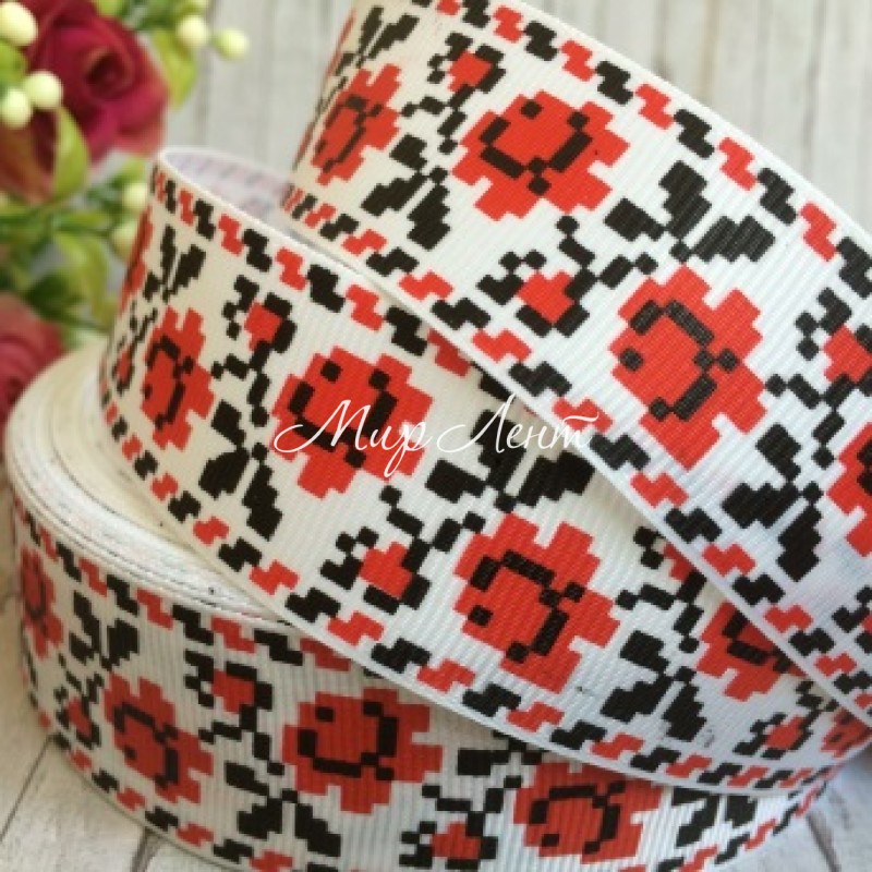 Репс 2,5 см, білий, з вишитими червоними трояндами