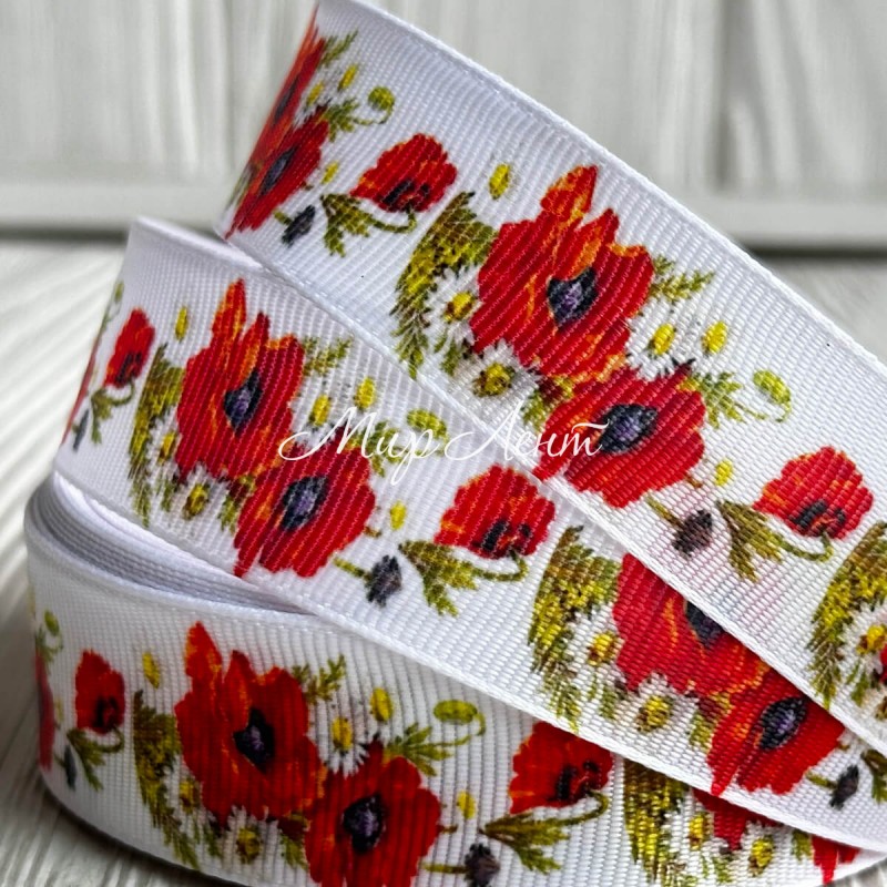 Репс 2,5 см, червоні маки з ромашками, на білому фоні, метр