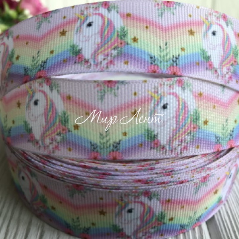 Репс 2,5 см, Єдиноріг з райдужною гривою на білому, метр