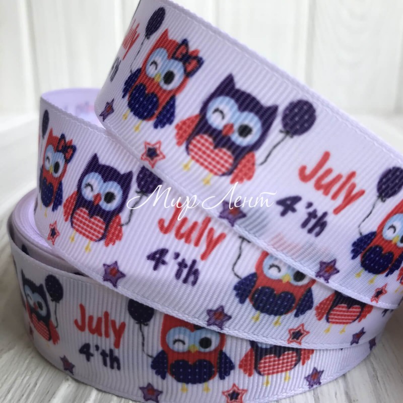 Репс 2,5 см, червоно-сапфірові сови на білому, метр