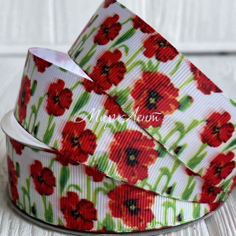 Репс 2.5 см, червоні маки, на білому тлі.