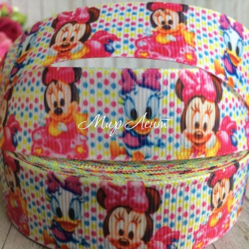 Репс 2,5 см, крихти Мінні та Дейзі, білий у кольоровий горошок, 1 м