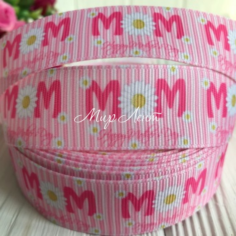 Репс 2,5 см, М ромашка М на рожевому
