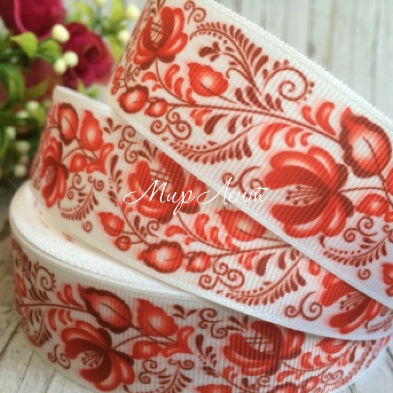 Репс 2,5 см, білий, з вишитими кораловими трояндами, метр