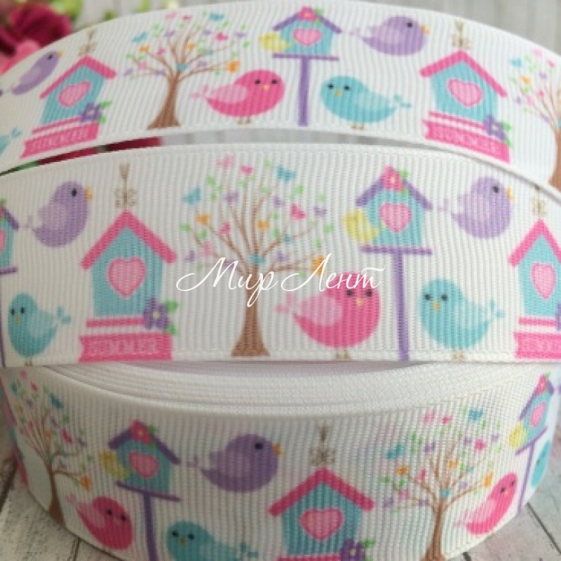 Репс 2,5 см, пташки-дерево-шпаківня, білий, 1 м
