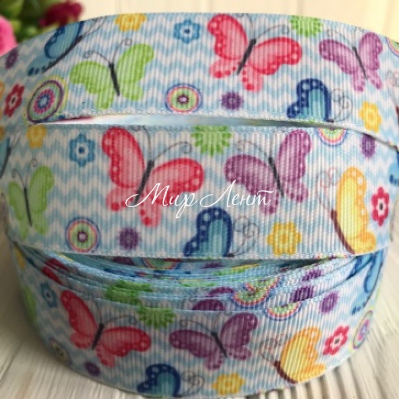 Репс 2,5 см, різнокольорові метелики на блакитному