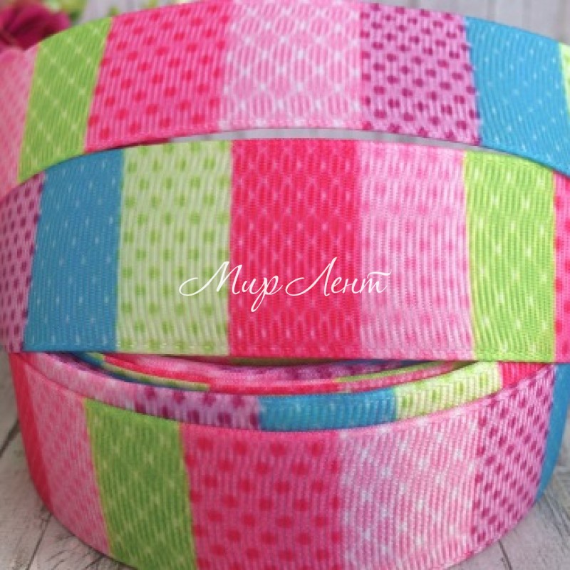 Репс 2,5 см, салатово-малиново-бірюзові квадрати з горохами та кліткою, 1 м
