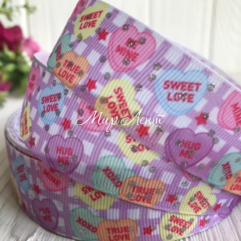 Репс 2,5 см, серця sweet love з глітерними крапками на біло-бузковій клітці, метр