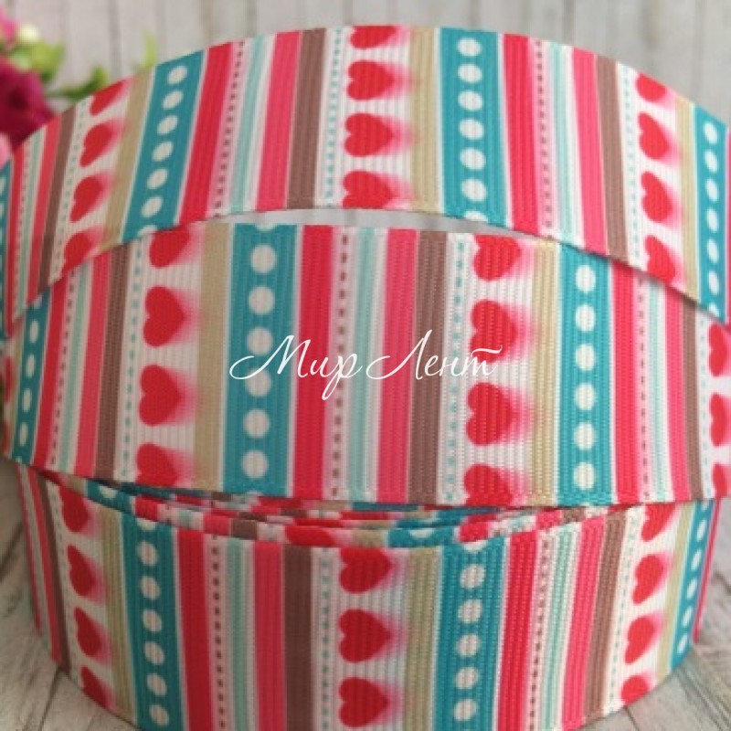 Репс 2,5 см, смуги та серця, морська хвиля-малиновий-кавовий, 1 м