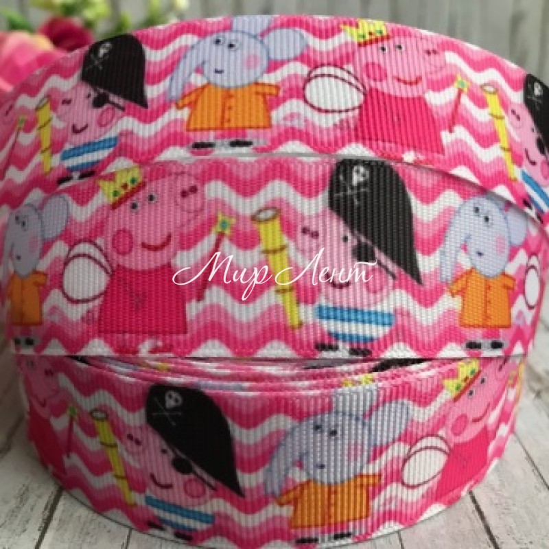 Репс 2,5 см, свинка Пеппа та Джордж пірат, біло-ярко-рожева хвиля, 1 м
