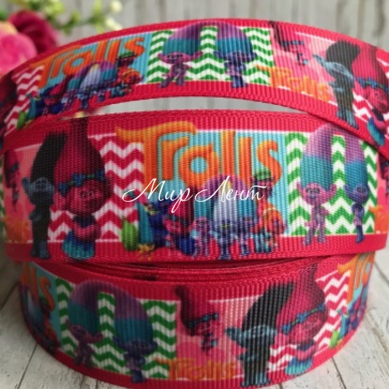 Репс 2,5 см, Тролі, різнобарвний шеврон із малиновим кантом, 1 м