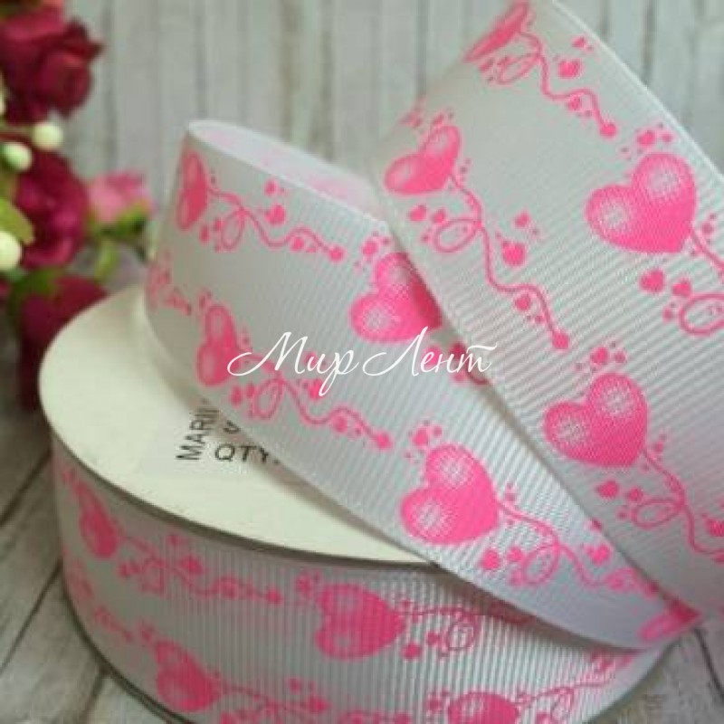 Репс 2,5 см, візерунок із серця, яскраво-рожевий