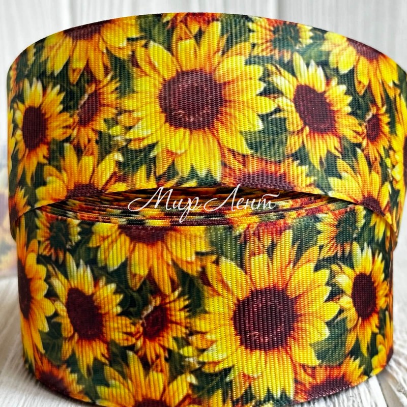 Репс 4 см, жовті соняхи, на зеленому фоні, рулон 23 м