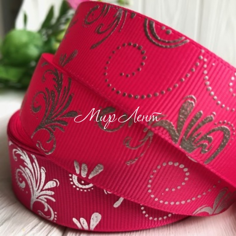 Репс із вензелями, 2,5 см, малиновий (срібло)
