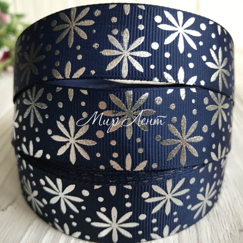Репс з квіточкою (фольга), 2,5 см, сапфіровий зі сріблом, метр