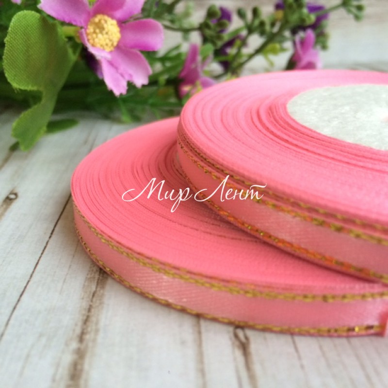 Атлас 0,6 см люрекс золото, коралловый, рулон 33 м