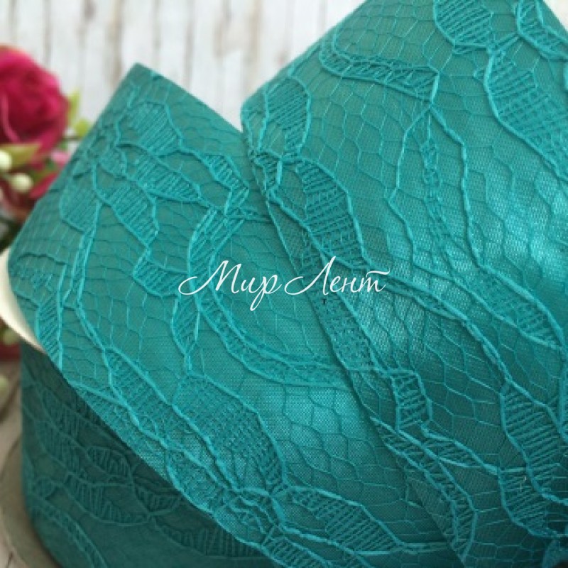 Атлас 4 см, кружево, морская волна