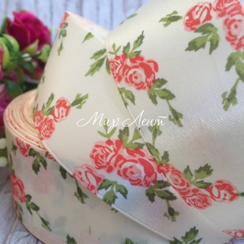 Репс 2,5 см, Китти с цветочками, красный с розовым